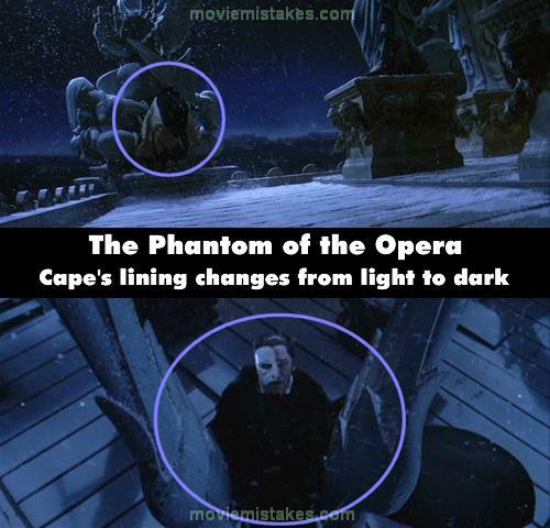 Continuity mistake: On the Opera House's rooftop, the lining of the Phantom's cape goes from light-coloured to black before and after he jumps on the statue. It has nothing to do with lighting, and his waistshirt proves it: much darker than the cape's original lining, it makes it obvious the cape's turned dark since the waistshirt looks paler against it. (01:15:55)