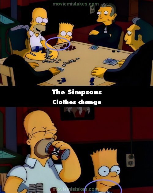 Continuity mistake: When Homer is gambling with the gangsters, you can just barely see the shoulder of an ORANGE shirt that Bart is wearing, but in all other shots he is wearing his tuxedo. (00:12:10)