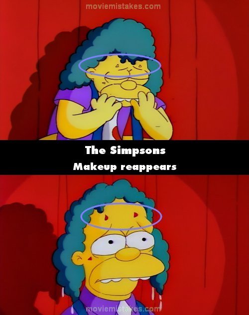 Continuity mistake: In Krusty's story after he has his makeup washed off by a rabbi, just after his father speaks to him his makeup suddenly reappears. (00:09:40)