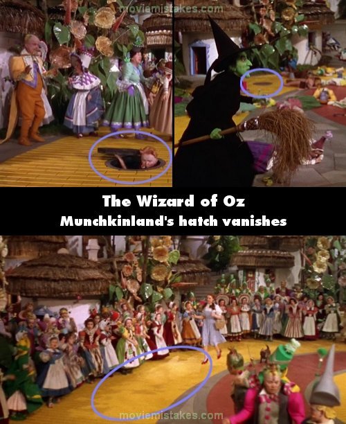 Continuity mistake: When the Munchkins come out onto the Yellow Brick Road, one of them comes out of a sewer hatch on the yellow bricks. It's located on the ground in front of the first small white cottage with the thatched roof, right behind Dorothy's house. Throughout this scene, the dark hatch is visible whenever we see that specific location, such as when the Wicked Witch of the West asks, "Who killed my sister? Who killed the Witch of the East? Was it you?" but as Dorothy begins to "follow the yellow brick road", there is an overhead shot followed by a front shot and the dark hatch has disappeared.
