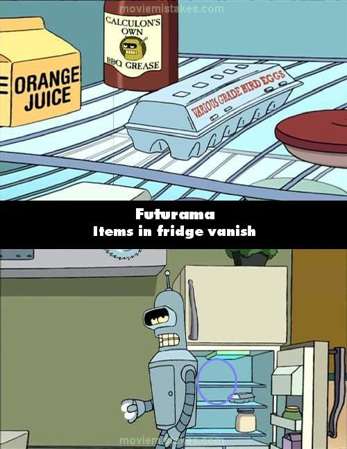 Continuity mistake: When Bender is making the cake, when he gets the ingredients from the fridge, there are a lot fewer items when the shot changes. (00:05:20)