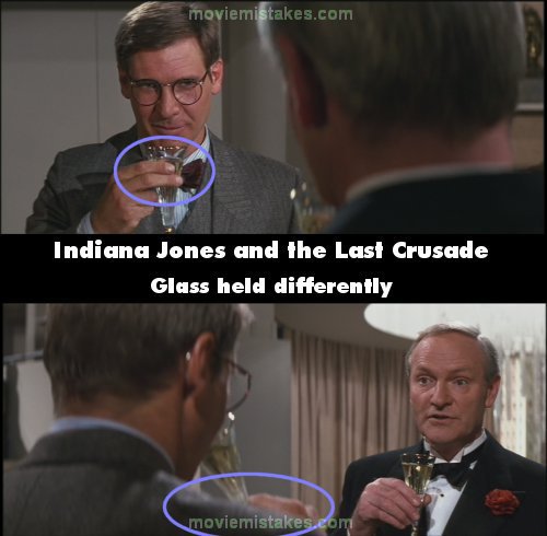Continuity mistake: When Indiana is drinking champagne with the businessman in the fancy apartment he holds his glass by the stem in one shot and then by the bowl in the next shot. As the conversation continues the glass goes up and down in Indiana's hand like a yo-yo.