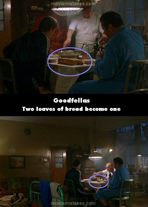 Continuity mistake: As the wiseguys in prison are about to have dinner, there are two loaves of bread on the table. The following shot one of the loaves disappears. (01:22:15)
