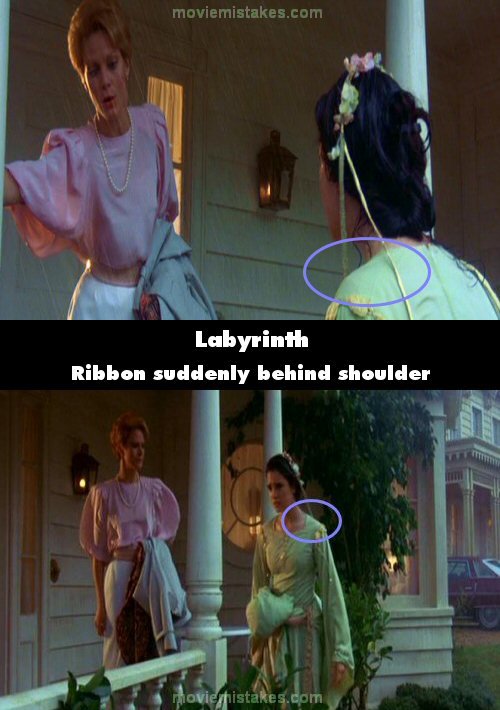 Continuity mistake: When Sarah arrives home with Merlin, she talks to her mom for a while. The white straps that hang down from her flower headband alternate from hanging in front to behind her shoulders during the shots. (00:04:40)