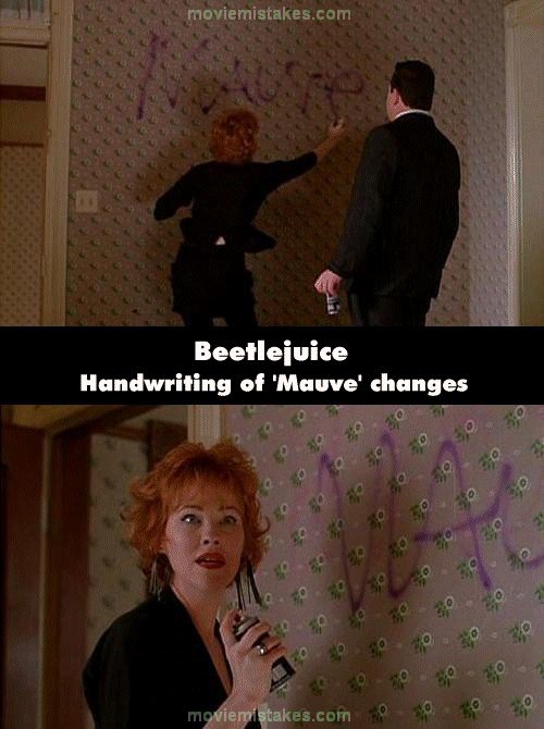 Continuity mistake: When Delia spray paints the word “mauve” on the wall, between shots it is apparent that the script of the word changes. One example would be that in the first shot the tops of the letter “M” are pointed, like triangle tips, but in the next they are more rounder. The writing also moves lower on the wall. (00:15:50)