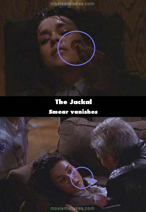 Continuity mistake: Toward the end of the movie, the assassin (Willis) fatally shoots the female Russian agent (Venora). As Willis is advising Venora that she will die within twenty minutes, he draws a picture on her cheek with her own blood (a grim pictogram of a love heart). When Gere arrives on the scene a few minutes later, there is no sign of blood anywhere on Venora's face. Obviously, the authorities would not have washed away such a vital clue. Neither would emergency personnel have transferred the victim from the floor where she was lying, onto the living room couch; rather, they would have put her on the ambulance stretcher. (01:26:00 - 01:27:15)