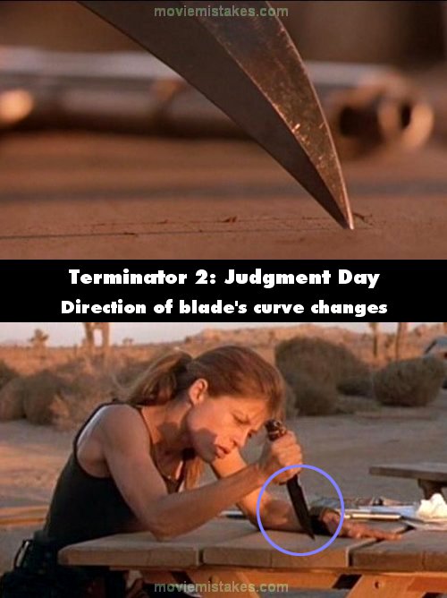 Continuity mistake: When Sarah carves "No Fate" into the desk, the tip of the knife curves toward her, then you see it facing away, then when John grabs it from the desk its tip is back toward him. (01:32:45)