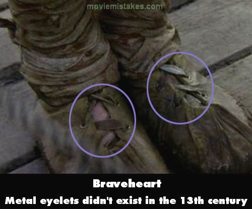 Revealing mistake: William Wallace's footwear (as seen at the end of the movie) has metal eyelets. Either he was ahead of his time or wardrobe wasn't paying attention to detail. (02:40:20)