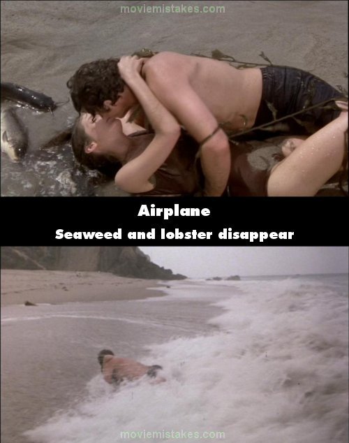 Continuity mistake: During the kissing on the beach, the seaweed on Striker's body and the lobster behind Elaine disappear when the second wave comes. (00:24:35)