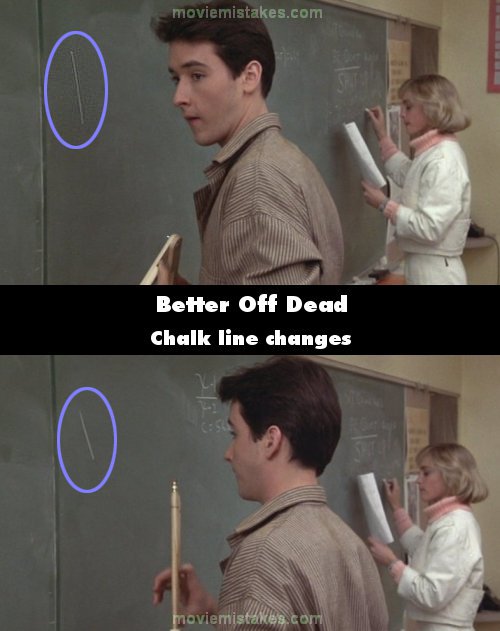 Continuity mistake: In the classroom scene, Lane is called to the board to demonstrate a math problem. When he draws the first line, it screeches, and cuts to the class hollering with their hair on end. When it cuts back to Lane, the line is half the original length. (00:25:20)