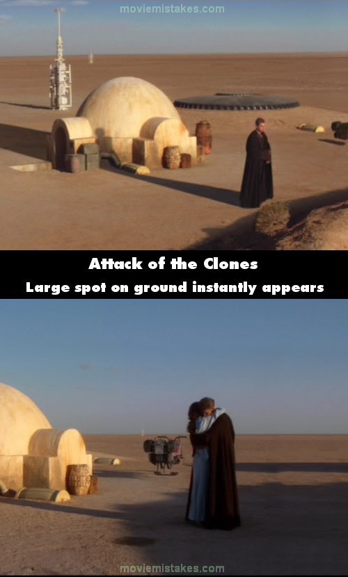 Continuity mistake: When Anakin and Padmé embrace outside the moisture farm, there's a dark, round spot in the sand next to them, that wasn't there in the previous shot of Anakin. Anakin can't have been standing on it in the previous shot, because he is standing about one metre away from the position of the spot in both shots (watch his shadow, it is in the same position in both shots). (01:11:00)
