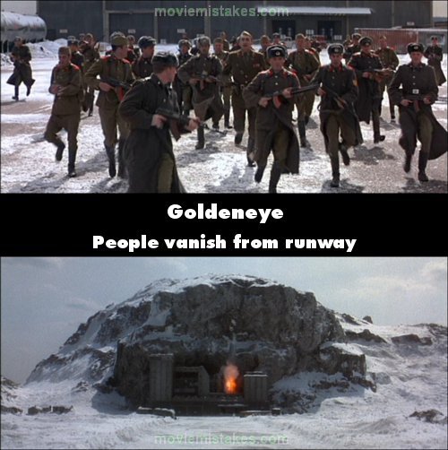 Continuity mistake: When Bond is flying the plane (after freefalling from the motorcycle) over the chemical plant at the beginning of the film, the people who have been chasing him down the runway have vanished. (00:10:17)