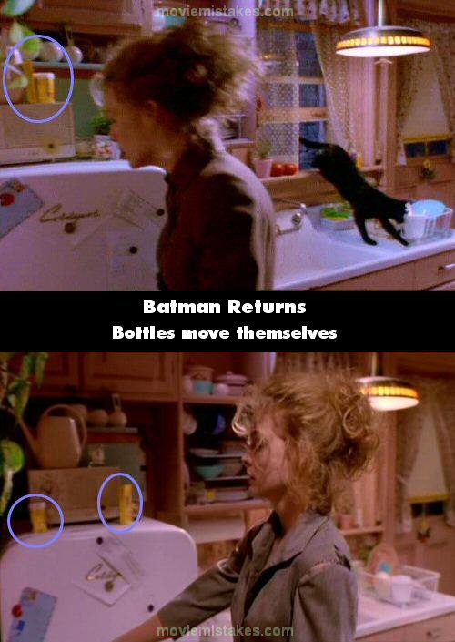 Continuity mistake: The yellow bottles of fish food jump from the radio to the fridge, from when Selina arrives home the first time, goes off back to work, then returns back home the second time. (00:22:30 - 00:28:50)