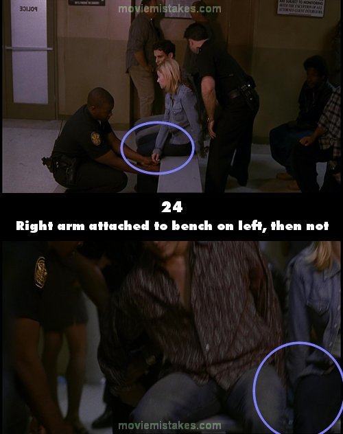 Continuity mistake: In the police station, Kim's right arm is handcuffed to the bench as we see the profile/ master shot of her and Rick, but in the next shot, (the medium/front), Kim's right arm is behind her now and not cuffed, as Rick is being cuffed to the bench. A few seconds later, her right arm is again handcuffed to the bench. Kim's right arm is moving around as she talks to Rick and the scene progresses. Her left arm is finally uncuffed when the detective goes to book her. (00:06:20)