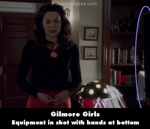 Visible crew/equipment: Rory gets dragged in the bathroom to discuss hem lines and the entire time the mic guy can be seen in the shadow on the wall behind her.