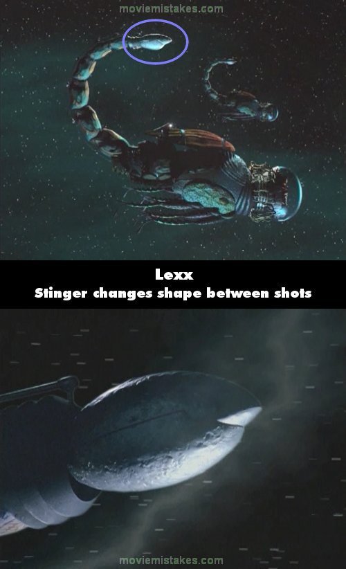 Audio problem: Right after the Cluster Lizard gets into where Xev is being held to change her body and mind and eats the 790 Unit, it cuts back to Stanley walking. Two larger robots come towards him and he swerves to avoid them, while you can hear their loud clunky footsteps. However the sounds of their steps do not match up with when they are stepping. (00:41:25)